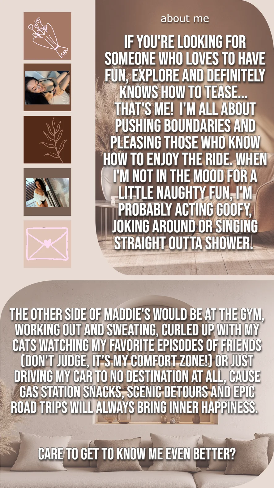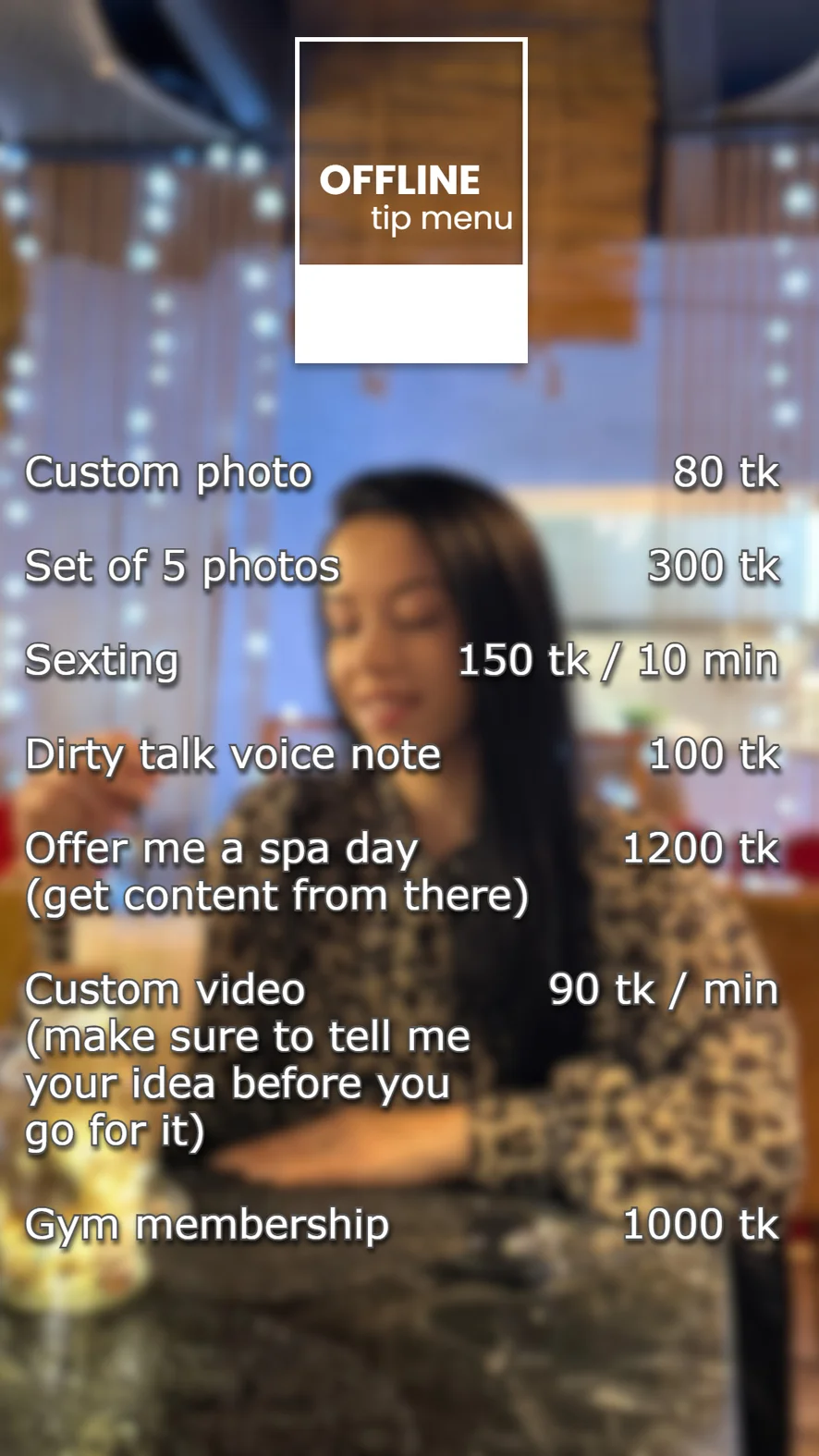 Cameltoe, Pik beoordeling, Dildo of vibrator, Dirty Talk, Erotische dans, Flashing, Striptease, Topless, Twerken, Ahegao, Korset, Strapon, Tietneuken, Roken, Tepelklemmen, Pijpen, Deepthroat, Op z'n Hondjes, Facesitting, Vingeren, Voetfetisj, Handjob, Hakken, Nylon, Olie show, Douche, Spanking, Buiten, Rokje omhoog, Kokhalzen, Cuckolding, Hardcore, Vernedering, Aftrek opdracht, Leer, Masturberen, Meesteressen, Orgasme, Rollenspel, Seksspeeltjes, Anale speeltjes, Pinnen, Yoga, Anaal, Cowgirl