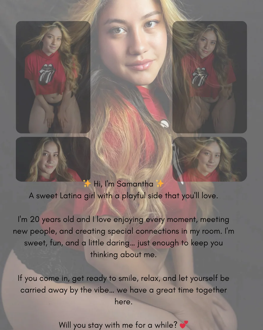 I'm 20 years old and I love enjoying every moment, meeting new people, and creating special connections in my room. I'm sweet, fun, and a little daring… just enough to keep you thinking about me.